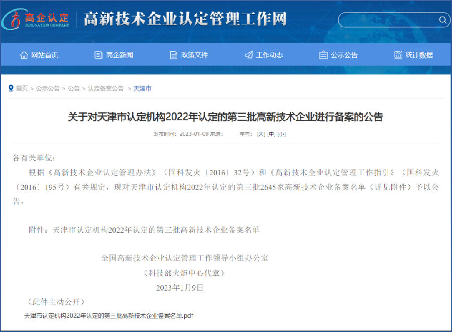 近日,國家科技部發(fā)布了《關(guān)于對天津市認(rèn)定機構(gòu)2022年認(rèn)定的第三批高新技術(shù)企業(yè)進(jìn)行備案的公告》,公司成功邁入國家高新技術(shù)企業(yè)行列!