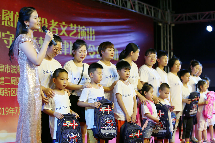 在項目部舉行的慰問建設(shè)者演出上,在舒緩的音樂中,十多個家庭“大手”牽著“小手”走上舞臺,工作人員把嶄新的書包送到每一個孩子的手里。孩子們回應(yīng)一聲聲清脆的“謝謝”。