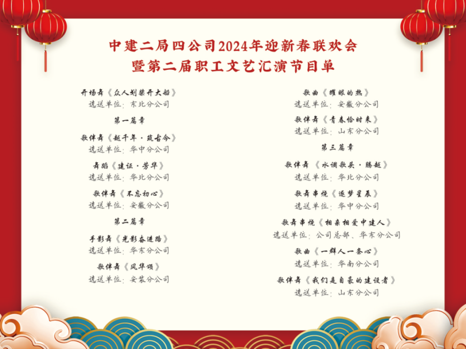 1月26日,中建二局四公司迎新春聯(lián)歡會暨第二屆職工文藝匯演在津舉行。公司領(lǐng)導(dǎo)班子,公司總部職工,各單位職工代表參加現(xiàn)場活動。