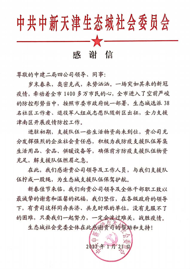 近日,公司收到來自共青團天津市濱海新區委員會和中共中新天津生態城社區委員會的表揚信,信中對公司積極為疫情防控一線工作者捐贈物資的行為給予了充分肯定和贊揚。